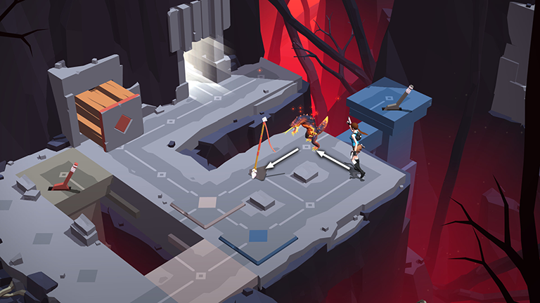 Again, depressing the blue pad moves the blue block to the left, close to the exit. Throw the spear at the lizard, immobilizing it on the pressure pad for the next four turns.