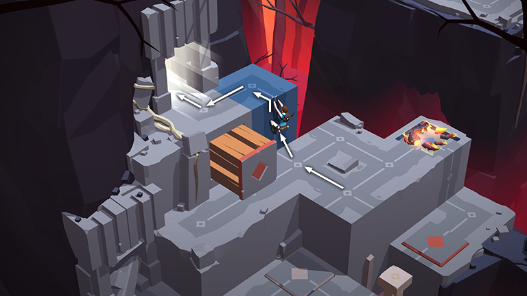 Move back to the upper left. Then twice to the lower left until Lara is standing on the tan pressure pad. This shifts the tan block to the left. The lizard follows two steps behind.