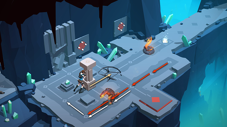 Step onto the orange pressure pad, triggering both arrow traps. The arrows hit the lizard and the snake , disabling them for the next four and five turns, respectively. (The snake also shields Lara from the arrows.)