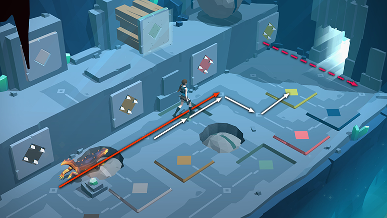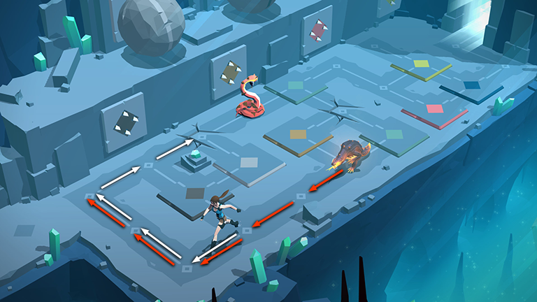 Move back to the lower left, then twice to the upper left, then twice to the upper right, onto the first cracked floor area. The lizard follows two spaces behind, ending up in the left corner where Lara began the level.