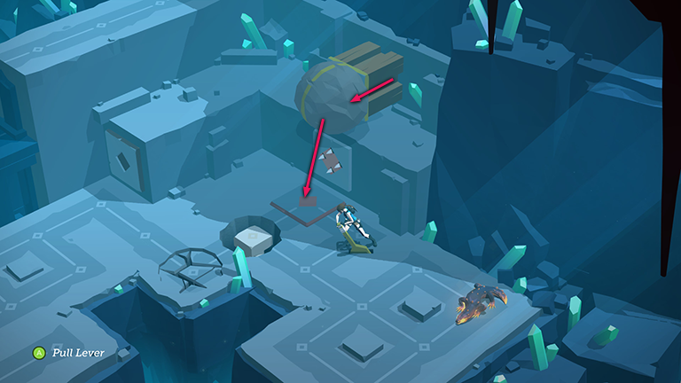 Use the lever again to retract the block trap. Then step onto the pink block. In this turn, the boulder continues to roll forward and falls through the first section of cracked floor.