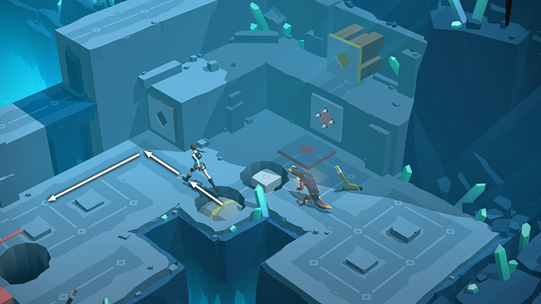 Step to the right onto the next section of cracked floor. Then move two spaces to the lower right so Lara ends up beside the movable pillar.