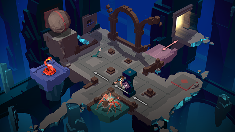 Move back three spaces to the lower left. Spirit Lara mirrors your movements. The spirit lizard follows two spaces behind her, ending up on the teal pressure pad, which causes the teal block to slide to the right. The spider, meanwhile, moves back and forth within the beam of light.
