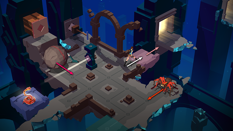 Move to the lower left then twice to the lower right in order to get back to the purple lever. As you do this, Spirit Lara moves off the pink pad and into the left corner. The spirit lizard, still following two spaces behind her, moves onto the pink pad, activating the arrow trap again and killing the spider. When the spider dies, the pink block slides back to its original position.