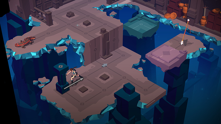 Hop onto the movable pillar. As Lara steps out of the light, the gray block slides to the left so you can jump onto it. Meanwhile, the lizard follows two spaces behind. As it moves into the light, the gray block moves back to the right with Lara riding on top.