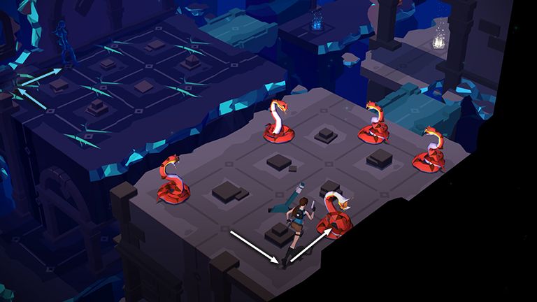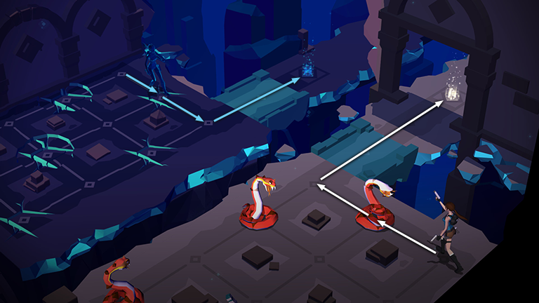 So start by moving to the right, then forward to kill the first snake on the right side of the room. Meanwhile, Spirit Lara moves left then forward, passing over the cracked floor in the left corner.