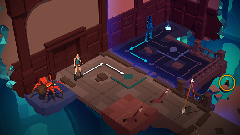 Now that you have the lizard's attention, move back to the upper left twice, onto the pressure pad, then to the lower left. As Lara moves on and off the pad, the gray block moves to the left and then back to the right. Meanwhile the lizard follows, two spaces behind, and Spirit Lara mirrors your movements on the other side of the room.