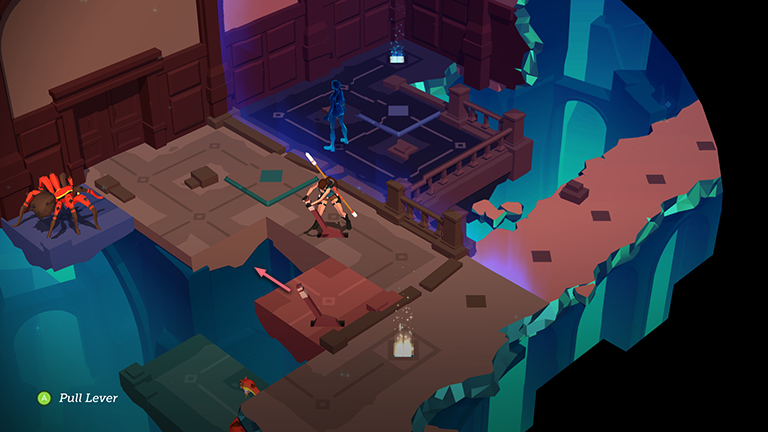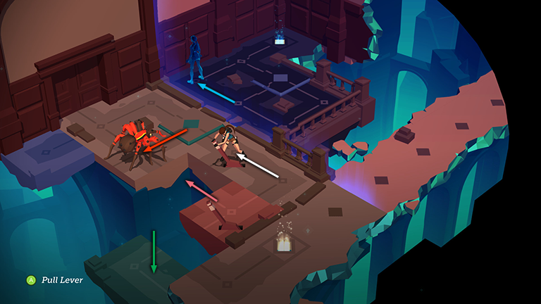 Pull the lever on the pink block to slide the block, with Lara standing on top, to the lower right. There is no corresponding movable block on Spirit Lara's side of the room, so she stays where she is for now.