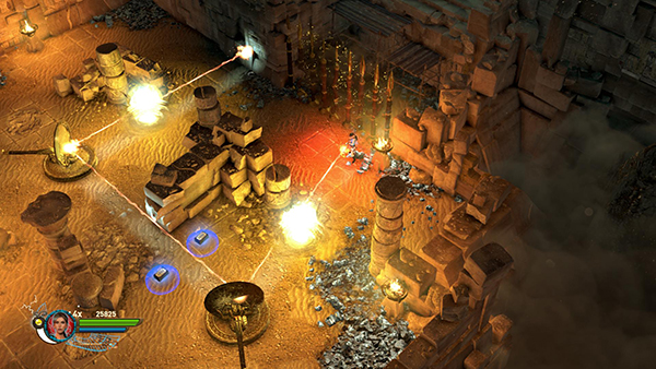 SKELETON BATTLE AND FOURTH MIRROR PUZZLE: The gate closes behind you and you're trapped inside with a flaming skeleton warrior with a shield. More shielded skeletons and scarabs soon join the fight. The skeletons deflect most of your weapon fire with their shields, so you may want to run around, letting them chase you as you drop and detonate remote bombs in their path. The bombs damage the skeletons and also cause them to stumble temporarily, so they are vulnerable to guns or staff. In co-op mode one character can distract the skeletons while the other shoots them from behind. Just try to avoid the Marks of Set, since they will hurt you. There is more ammo in the middle of the room if you need it.