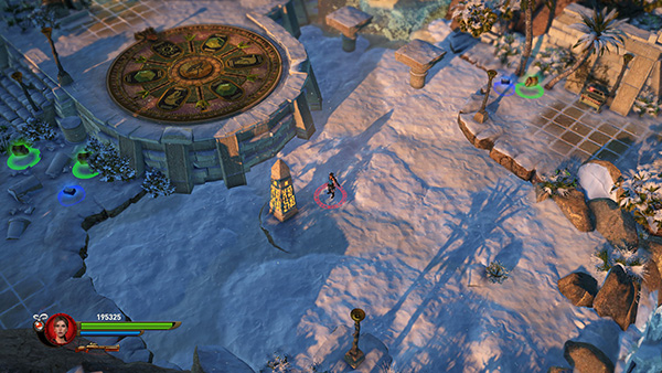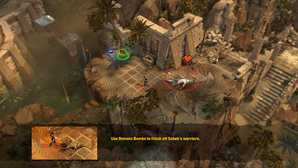 TOMB ENTRANCE AND CROCODILE ROULETTE: Pick up gems, health, and ammo as needed. Then approach the elaborate symbol wheel on the ledge near the entrance. Use the staff to destroy the Mark of Set. Doing so also activates the wheel. Drop a remote bomb in the center of the spinning wheel and detonate it when you see the button prompt on screen. The wheel then slows to a halt, and whichever tile stops near the pointer flips over. Depending on the symbol revealed, one of three things happens: a shower of gems rains down upon you, one or more minions of Sobek appear for you to fight, or the entrance to the tomb opens. (screenshots)
