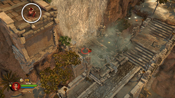 WATERFALL AND STAIRS LEADING UP TO THE TOMB: Just beyond the arrow traps on the left you'll find the first red skull (1/5) in this area. Jump across the pillars to get it and then jump back the way you came. (screenshot) Beyond the skull pedestal are some breakable urns and a few gems sitting beneath a waterfall. You'll also catch a glimpse of another red skull on a high ledge (screenshot) but you can't reach it from below. You'll get it in a little while.
