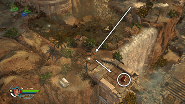 The next red skull (2/5) is ahead on the right. On the wide ledge with the round symbol, grapple the golden ring and rappel down the cliff to snag the skull. (screenshot) In the co-op game, have one character grapple another and lower him (or herself) down. Climb back up and continue up the stairs.