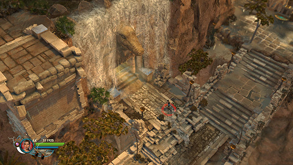 THIRD VISIT - AFTER TOMB OF THE LAMPLIGHTER: When you finish this level, you appear on the cliffside near the waterfall. (screenshot) An on-screen message reminds you that you still have one outstanding Objective: Retake the Piece of Osiris in the Oracle's Chamber.