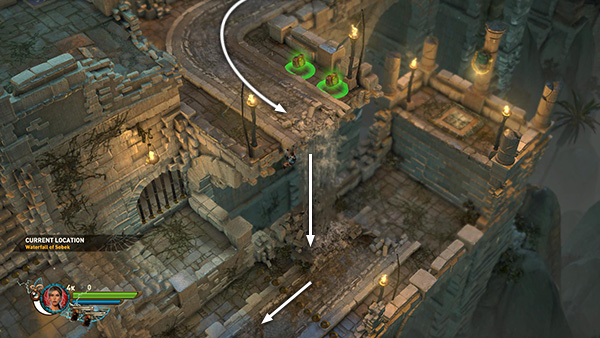 When you're ready to move on to the Tomb of the Lamplighter, cross the pool and head down the stairs toward the aqueduct. The waterfall where you found some gems earlier has now parted to reveal a doorway. (screenshot) Go inside.