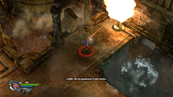 COLLAPSING FLOOR TILES AND RUN TO THE EXIT: As you move forward, the gate closes behind you and 6 gas vents come on. The next area is visible through the gate ahead. If you played Lara Croft and the Guardian of Light, you'll recognize the collapsing floor. These hazardous tiles crumble away beneath you as you move over them, so you'll need to go quickly. If you're playing the co-op game, you may want to assign each player to the left or right side of the course to avoid falling into the gaps the other(s) leave behind.
