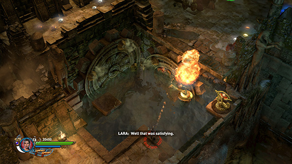 In all versions, once the gas vent in the left corner is lit, the puzzle is solved and the water in both pools begins to boil, causing a set of columns to rise in the pool above. If any of your characters are still on the lower level, wait for the flames on the middle gear to go out and then carefully grapple up onto the ledge, making sure not to touch the boiling water for the hot water challenge. Then use the columns to reach the wide corridor above. (screenshots)