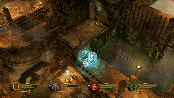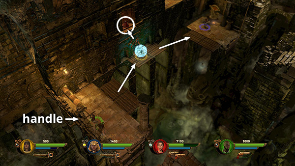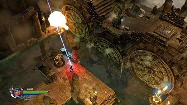 SECOND ROTATING GEAR PUZZLE: Kill the crocodiles in the pool on either side of the platform. Then move toward the end to trigger a few more enemies: A Sobek warrior (or two in co-op) from the water near the huge gears (screenshot), plus a few scarabs and skeletons from ahead and behind. If necessary, you can roll past them and up the stairs at the entrance. Then deal with the enemies as they approach. (screenshot) Afterward, bomb the cracked floor, smash the vases, and pick up more gems before tackling the puzzle.
