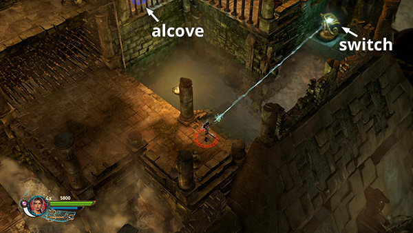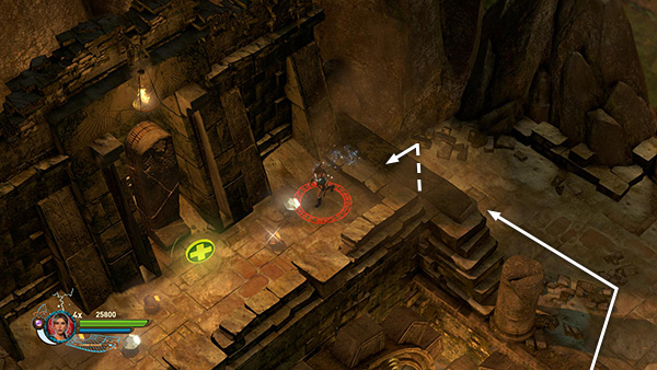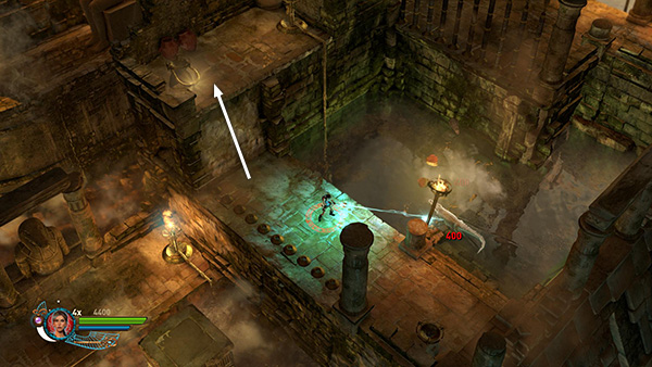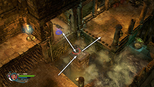 STARTING AREA: Smash the vases and light the braziers on the way downstairs. Stepping on the pressure pad at the bottom triggers a brief cutscene in which the a gas vent ignites, boiling the water in the nearby pool and killing an unsuspecting crocodile. Smash the remaining vases and light the braziers for gems. Shoot the crocodiles in the pool on the right. (You won't receive points for the kills if you boil them.)