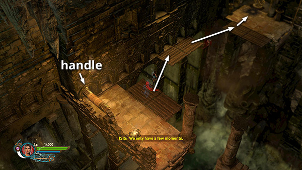 In 2-player co-op, either player can pull the handle so both can then jump across the wooden ledges. On the other side, Lara can use the Egyptian character's shield to reach the ledge above. Then she can grapple Isis/Horus and lower her/him down to the red skull. (screenshot)