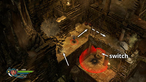 NOTE: In the walkthrough for the first level I attempted to note the location of every gem, breakable urn, etc. In later levels, I don't mention them all. So unless you're attempting a time challenge, stay alert. Try to kill every enemy, light every brazier, and break or blow up every destructible object, including vases, cracked floor tiles, sarcophagi, etc., for maximum score.