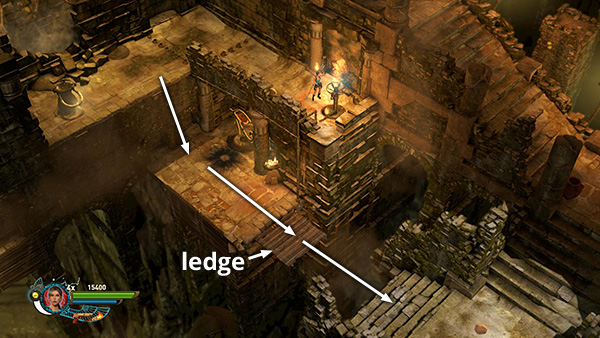 GOLDEN HANDLE AND COLLAPSING LEDGES: Continue up the stairs, turn left, and jump across the gap in the walkway. Pull the golden handle as far as it will go. Then quickly jump across the wooden ledges before they collapse. (screenshot) On the other side, grapple the golden ring and rappel down the wall to get the red skull (2/5). Then climb back up. (screenshot)