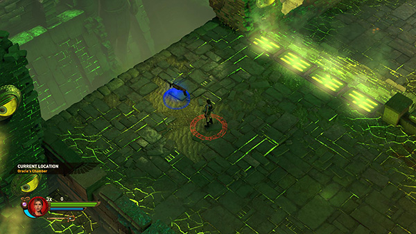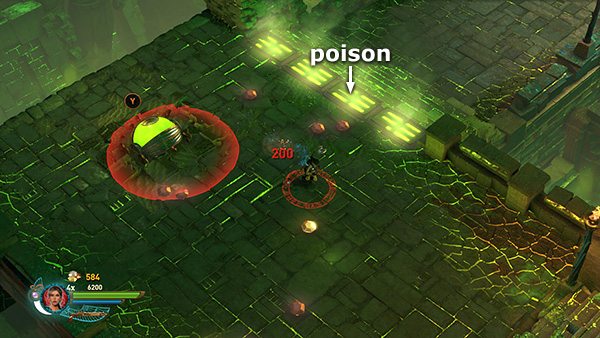 HIGH LEDGE WITH POISON VENTS (Co-Op Game): In the co-op game, instead of a switch, there is a pressure pad on the lower level. Have one player stand on it to deactivate some of the poison vents on the wall so the other can use the grapple ring to climb onto the ledge above. That player can then use a remote bomb to destroy the giant eyeball. This turns off the poison vents on the walkway but not the ones on the wall below. (screenshots)