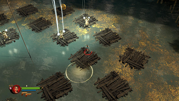 SOBEK BOSS FIGHT - PHASE TWO: The boss then retreats to the depths as several of Sobek's priests appear on the wooden rafts. As in the Tomb of the Lamplighter, these guys call down lightning bolts from above. These can injure your characters and destroy any raft on which they happen to be standing. So watch out for the white circles and move away before the lightning hits. (screenshot)
