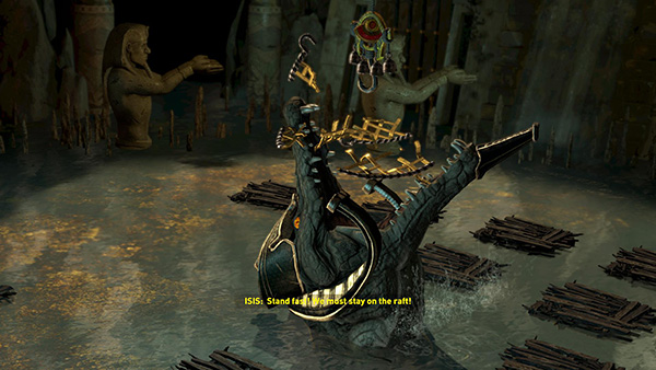 Like the previous boss, Khepri, Sobek is practically invulnerable, but he does have a weak spot. You'll need to trick him into exposing it. When he disappears after his little appetizer, more wooden rafts bob to the surface. Some of these have time bombs on them. Since there are no other enemies about, this is a good time to attempt the Challenge: Feed Sobek Three Time Bombs at Once.