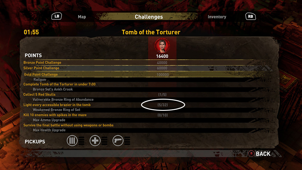 NOTE: You can check your progress toward each challenge, including the lighting of the braziers, on the Challenges screen.