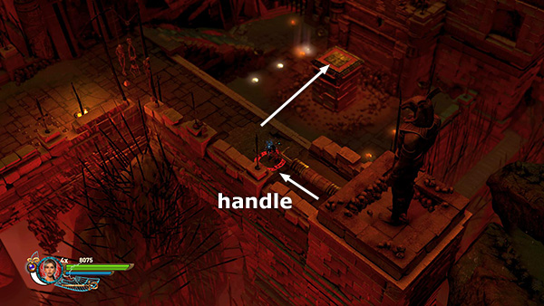 COLUMN WITH PRESSURE PAD SURROUNDED BY SPIKES: In the single-player game pull the golden handle to temporarily retract the spikes surrounding the column below. Jump from the ledge to grab the column and pull up before the handle retracts and the spikes pop up again. (screenshot) In co-op mode there is a grapple ring instead of a handle. Have Lara or Carter grapple the ring so another character can tightrope walk across and drop onto the column. (screenshot) Standing on the pressure pad on top of the column opens the gate below on the left. Carefully jump down and gather gems and light the 2 braziers (6-7/32) before leaving this room. (screenshot) Light another brazier (8/32) on the way up the stairs. (screenshot)