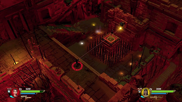 The trap in the 2-player game is slightly different. First make sure the switch is positioned so the red side faces out. That way the bars on the left side of the first pressure pad are open. Have one character run across skull tiles onto the pad. As he or she passes over each tile, spikes pop out of the floor, so don't reverse direction. Once the first character is safely on the pad, the other character should shoot the switch to toggle the gates. Now the first character can run around to the second pressure pad, snagging the red skull (3/5) on the way. While the first character stands on the second pressure pad, the other character should now shoot the switch again to toggle the bars, then run across the skull tiles onto the first pressure pad. Depressing both pads opens the exit. The second character should then wait for the spikes to retract before running around to the left to the second pad and then exiting. (screenshots)