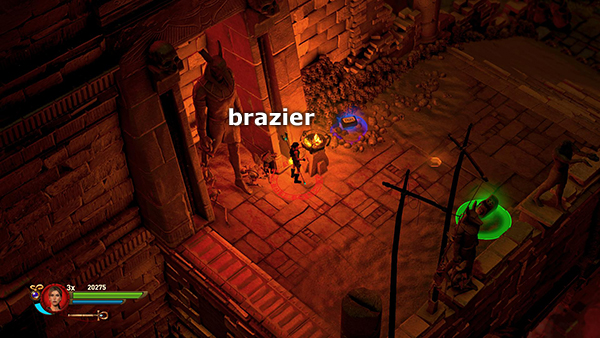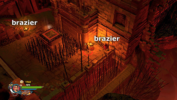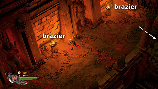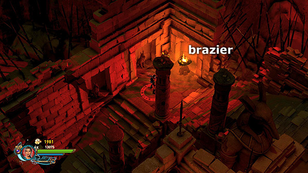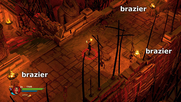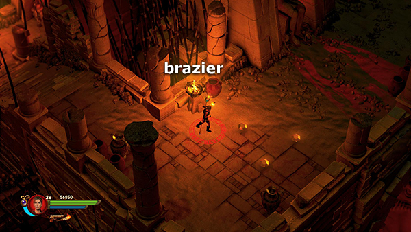 NOTE: In the walkthrough for the first level I attempted to note the location of every gem, breakable urn, etc. In later levels, I don't mention them all. So unless you're attempting a time challenge, stay alert. Try to kill every enemy, light every brazier, and break or blow up every destructible object, including vases, cracked floor tiles, sarcophagi, etc., for maximum score. I have, however, noted the locations of all the braziers for the challenge.