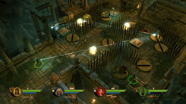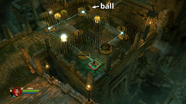 SINGLE-PLAYER CHALLENGE: Enter the tomb, smash some vases for gems, and scope out the puzzle. Amid various clusters of spikes there are 9 retracting mirrors and 3 pressure pads that control the mirrors. Each pad raises some mirrors and lowers others. In addition to Lara's weight, you have one metal ball to work with. (screenshot)
