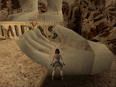 Cross the garden to the far left (northwest) corner. Climb on the low ledge, turn around and walk to the edge. Then take a standing jump to grab the edge of the roof. Pull up, take the large medi pack and enter the passageway at the back of the roof. Follow the passage to a cave with a statue of King Midas, now in pieces. If you want to, save your game first. (There's a convenient save crystal on a ledge near the statue.) Then, just for fun, jump onto Midas's hand. Reload and this time use the magic hand to change those LEAD BARS you've collected into GOLD BARS. To do this, face the side of Midas's palm and "use" the lead bars as you would use a key. (screenshot)