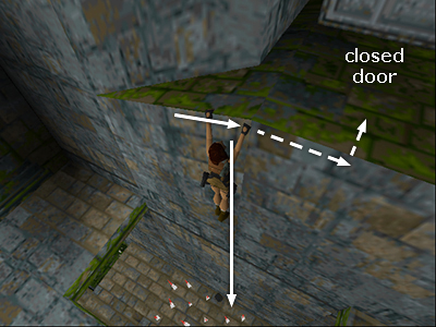 NOTE: Unless you open the door first, you will not be able to traverse all the way to the right in order to pull up into the doorway. It looks like there's plenty of space there, but the closed door functions like an invisible block. If this happens, traverse to the right as far as you can and drop down. Lara should land between the spikes. (screenshot) She'll take a little damage, but unless your health is very low, she won't die. Then go into the dark passageway opposite the spikes and pull the switch to open the door, as described above. Now you should be able to proceed.