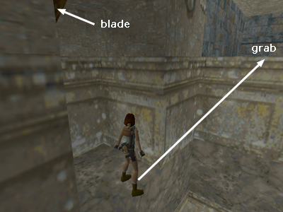 NOTE: If you haven't yet retrieved the save crystal here in the console game, you can get it without triggering the blade. Start from the ledge opposite the crystal and take a running jump across the gap to grab the ledge with the crystal. Pull up and use it. Jump back to the previous ledge, then to the square block, then to the ledge with the shotgun shells. In any case, it's not too difficult to get past the swinging blade if you do trigger it. Just stand facing the blade and the raised doorway beyond it. Position Lara just forward of the faint line between the two floor tiles nearest the blade. As soon as the blade begins to swing to the left, take a running jump past it to grab the doorsill ahead.