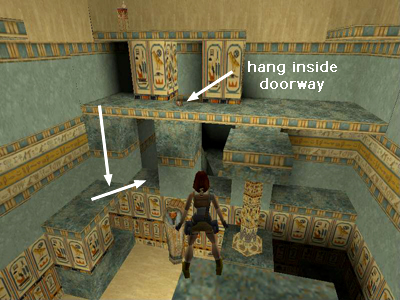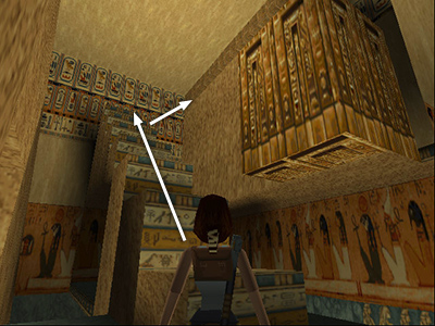 Climb onto the corner block, then the next higher ledge. Take a running jump to the large, square ledge ahead. Take another running jump to grab the block at the top right of the stone steps and pull up. (Console players will find a save crystal here.) Walk down one step and pull up onto the ledge at the doorway. This will awaken a mummy at the top of the stairs.