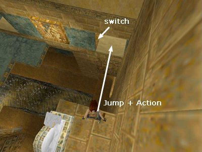 Halfway up the stairs you'll find a large medi pack. At the top is another switch. Use this to change the second (middle-level) slide in the previous room into steps, but don't return there yet. First, turn around so the switch is behind Lara and then hop down onto the ledge ahead. Go through the (north) door opposite the SCARAB. (This bridge is still up.)