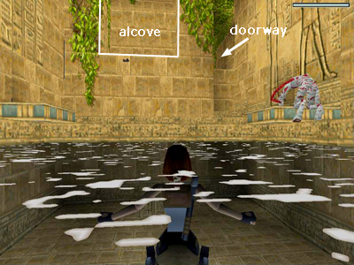 At the far end of the underwater tunnel, turn right and keep going forward, then up, to a pool where you can surface. On the bottom are some goodies: a small medi pack, shotgun shells and magnum clips. Now get ready to kill that mummy. The safest way I found was to swim to the edge of the pool opposite the raised alcove and doorway (shown in this screenshot). If you tread water there for a little while, the mummy will come toward you. When it does, swim quickly underwater to the opposite edge, climb out, run to the alcove to the left of the doorway and pull up. Kill the mummy from safety. Pick up the 2 sets of magnum clips (and the save crystal in the PS1 game). Hop down and climb up into the doorway.