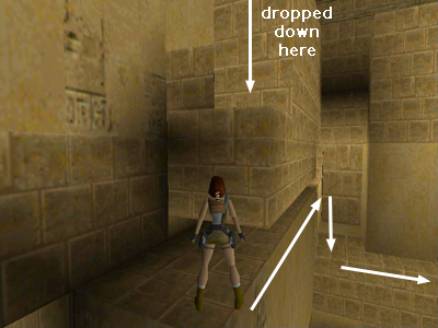 DARK ROOM WITH TWO MUMMIES: Just in front of where you got the medi pack is a doorway above a long stone ramp. Don't slide down or you'll be ambushed. Instead hang from the edge of the doorway to rouse the 2 mummies in the room below and then pull up. You could shoot the mummies from this doorway, but it's easier if you go to the right (north) end of the ledge and drop onto the rectangular ledge below. From there, jump into the opening that looks in on the room with the mummies (shown in this screenshot). You should be able to shoot them from here without getting hurt. Alternatively, slide down the ramp into the room, run to the right side of the ramp, and climb onto that same ledge from inside.