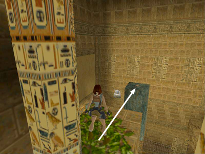 If you don't use the shortcut, go through the gold door next to the switch to emerge in the room at the top of the WIDE STAIRS, where you killed a mummy earlier. Descend the stairs, turn right onto the greenery-covered ledge (near the ANKH BRIDGE SWITCH, which you should have used earlier) and walk forward past the three painted columns. Here you'll find a ledge that juts out toward the square column with the artifacts. You'll need to take a running jump to reach the top of it. Walk to the edge and use the Look key to help set up the jump. When you hop back you won't be able to see where you're going because the camera will shift to behind the pillar, but trust Lara to get it right. (This screenshot shows the correct starting point.) Take a running jump, without pressing Action to grab, and you'll just make it. This is SECRET #2, the prize a small medi pack and Uzi clips.