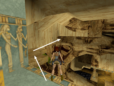 Walk out to the opening above the main area. Jump to the L-shaped stone ledge on the left. Go to the far end and take a running jump to the slightly sloped stone ledge beyond.