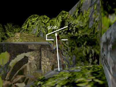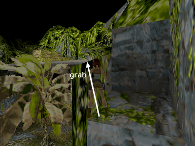 Once on top of this rock, turn left and position Lara near the middle of the block, a step or so back from the edge of the next block, which juts upward. (If Lara's feet are right against this edge, she won't be able to jump forward.) Then take a standing jump forward to grab the edge of the higher block ahead. Pull up.