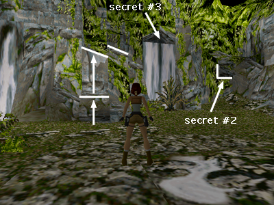 There are two secrets concealed near the double waterfalls in the northeast corner of the valley. To the right of the waterfalls, in the corner, is an opening in the rocks. Inside is secret #2. Between the double waterfalls and the other waterfall to the left (west) are some climbable rocks. Climb up twice then take a standing jump forward and to the right to the flat ledge near the wall.