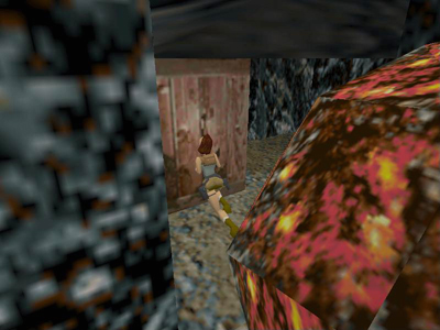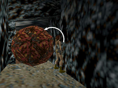 Turn to face the wooden crate. Use the Look button to make sure Lara is flat against the crate and facing it squarely. Then side flip to the left again as many times as it takes to work her into the space between the crate and the boulder.