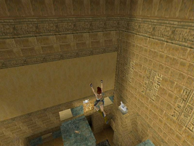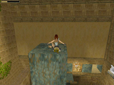 Stand at the edge of the opening and carefully adjust Lara's position so she's squarely facing the near right corner of the column. (Don't forget to use the Look button to make sure the path she'll travel is straight.) Then hop back once, so she's in the position shown above.