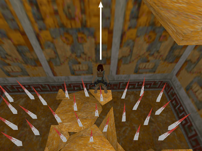 Then walk through the spikes to the area below the doorway. Sidestep into a clear spot, walk Lara right up against the wall. . .