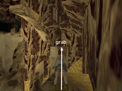 Take a running jump to the next low block up the slope near the cave wall. Pull up onto the ledge above. (It's hard to see in the screenshot above, so I have outlined it in white.)