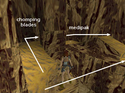 Walk forward and turn right. Advance slowly as there is a metal jaw trap just around the corner. Carefully run or jump through it, pick up the small medi pack and follow the ledge around to the right toward the switch. (Or, to avoid the blade trap, take a running jump from the jutting ledge to the path. Go left to get the medi pack, then turn around and head toward the switch.)
