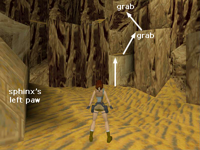 In the southwest corner of the cave, opposite the sphinx's left paw, is a light-colored block just the right height for climbing. Get on top of that block then take a standing jump to the angled block to the right. Turn around and take another standing jump to grab the brownish ledge above. Pull up.